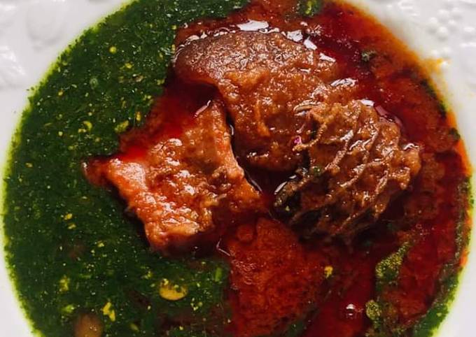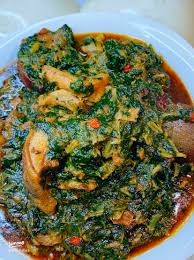 A richly seasoned green soup made with fresh leafy vegetables, palm oil, and assorted meats or seafood for a satisfying, home-style taste.