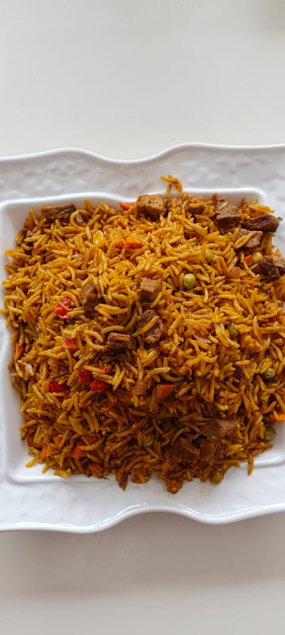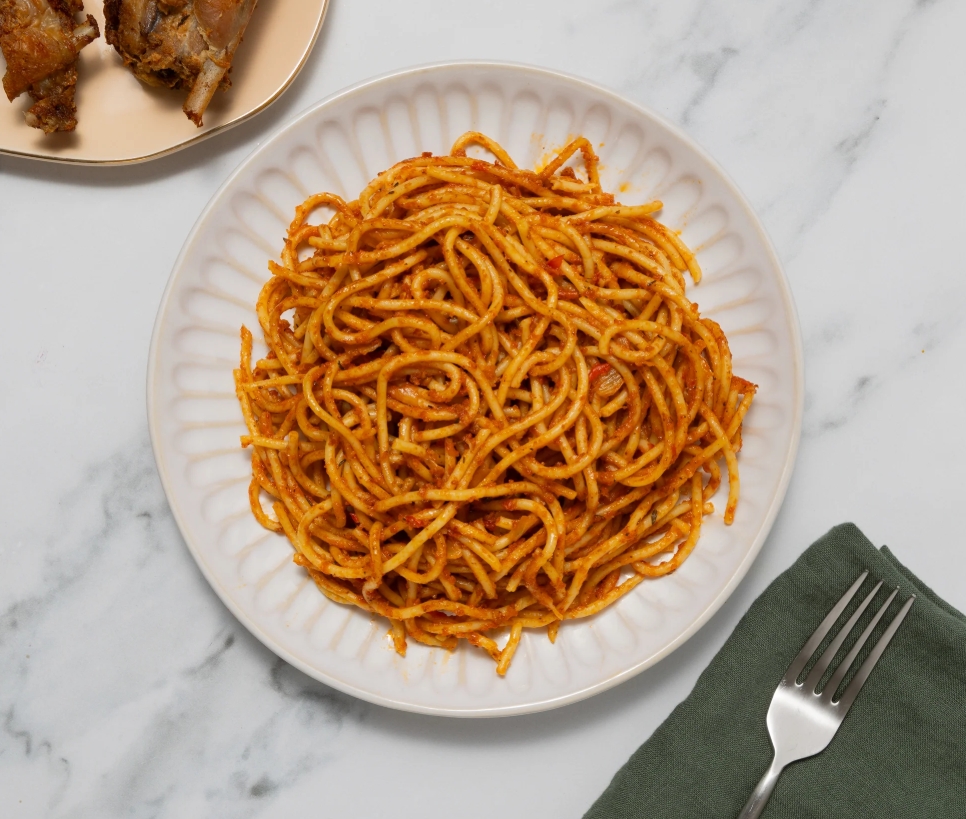 Spaghetti cooked in a bold, spicy tomato-pepper sauce with classic jollof flavor in every bite.